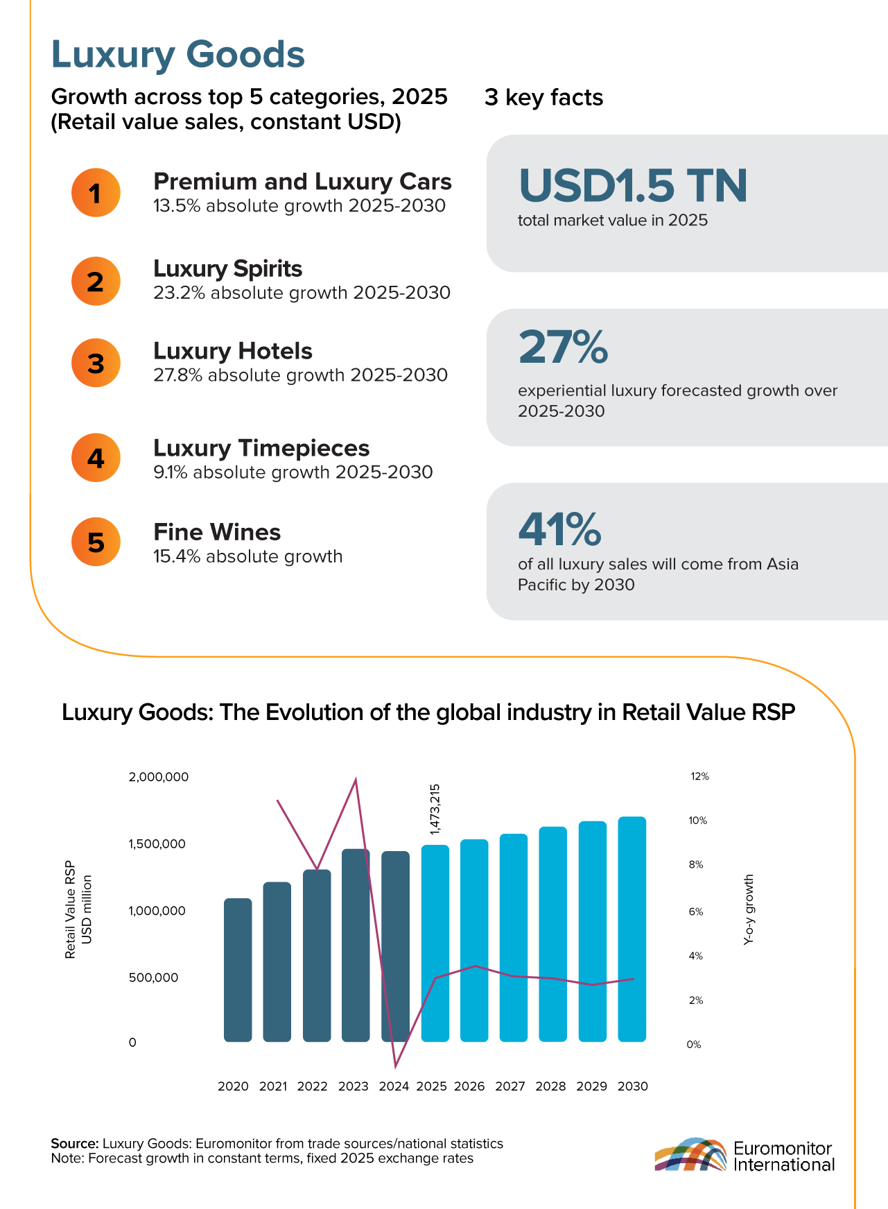 The global luxury goods market is projected to reach USD1.5 trillion in 2025, demonstrating continued resilience and steady growth despite ongoing economic and geopolitical challenges. The industry’s evolution is marked by strong performance in several categories, with luxury hotels, luxury spirits, and fine wines leading absolute growth forecasts through 2030. Premium and luxury cars and luxury timepieces also show robust expansion.