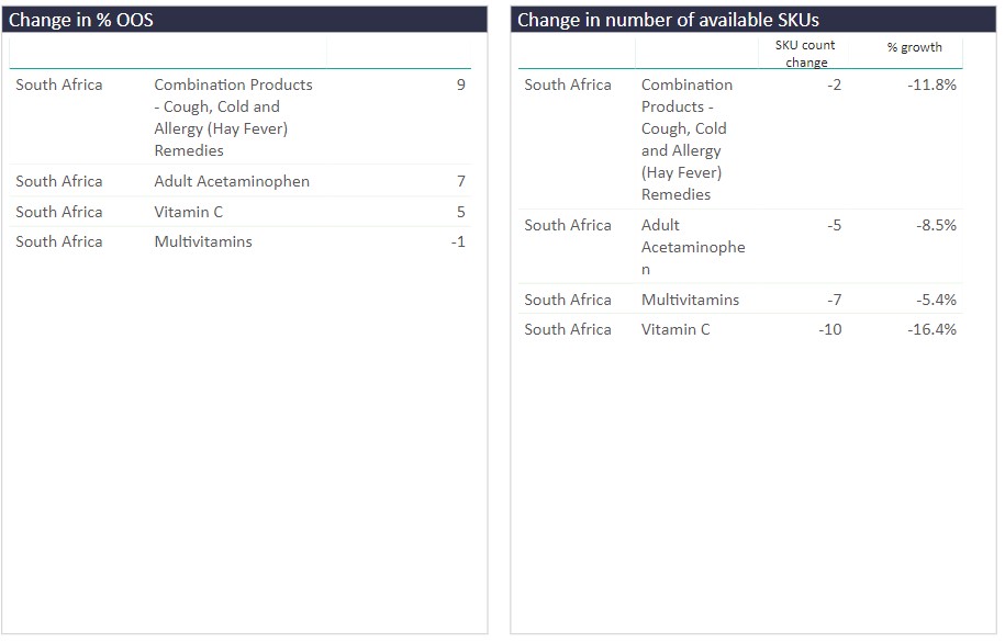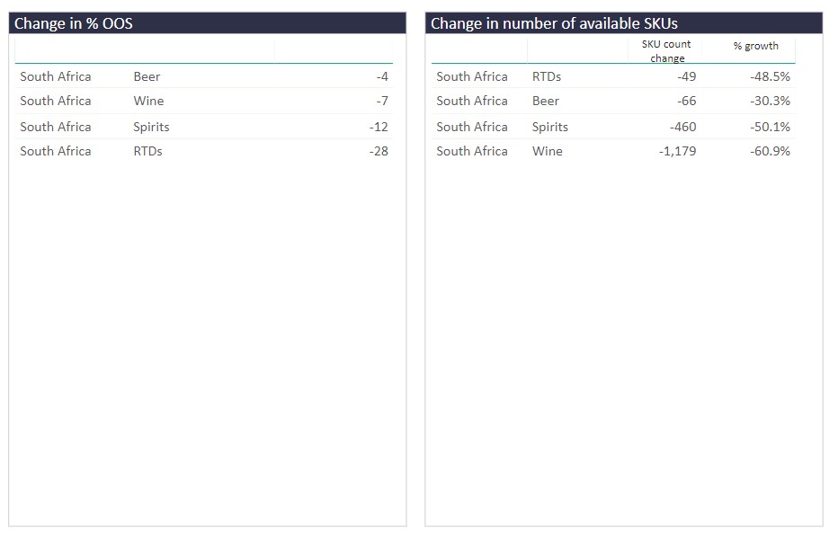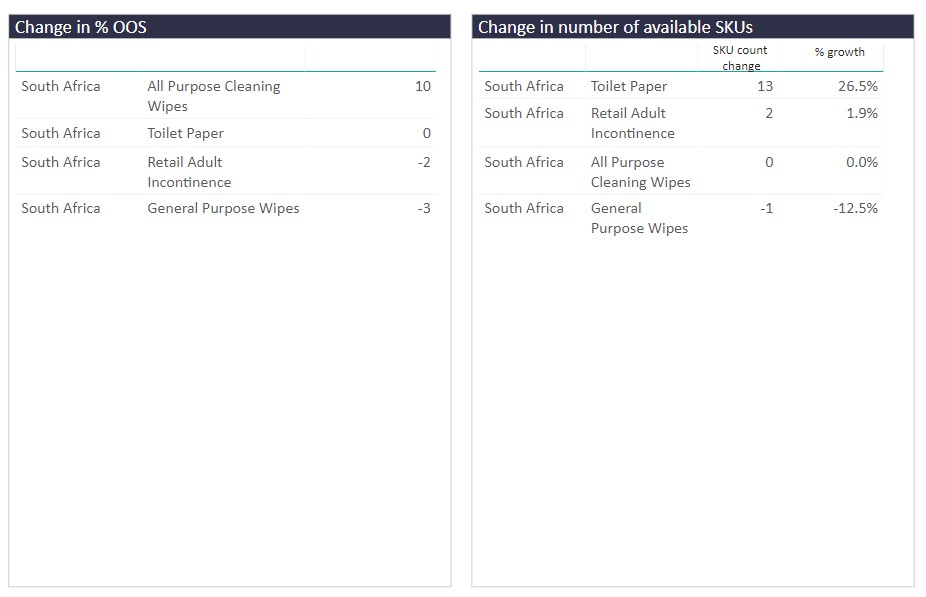 Looking at South Africa in particular, we can track how different product categories have been affected in terms of changing SKU availability and out-of-stock rates (OOS%) between 20th December 2020 and 20th January 2021.