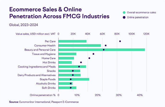 Pet care has the highest online penetration, with 30% of sales occurring online, followed by consumer health, accounting for 23% of sales in 2024, driven mainly by vitamins and dietary supplements.