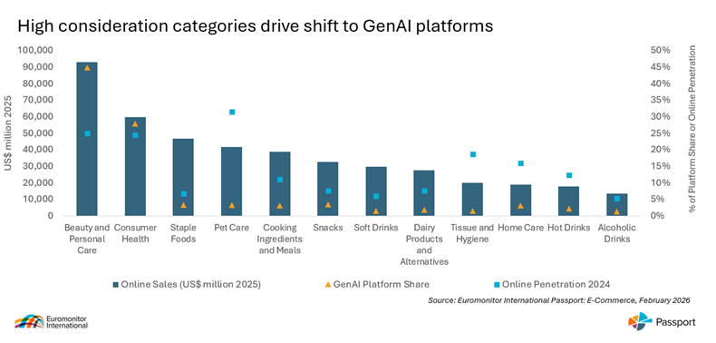 GenAI's influence varies significantly across retail categories, underscoring that online penetration alone no longer predicts success. Pet care leads in online share yet lags in GenAI referrals. Instead, beauty and personal care and consumer health dominate, combining strong online sales with high consideration products where consumers seek guidance and personalised recommendations.